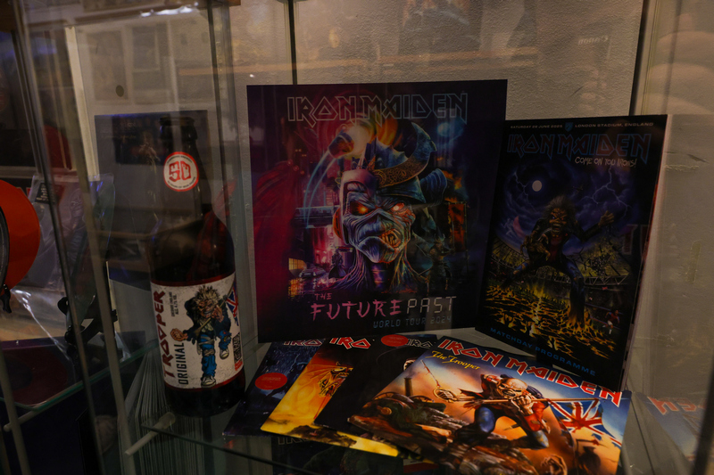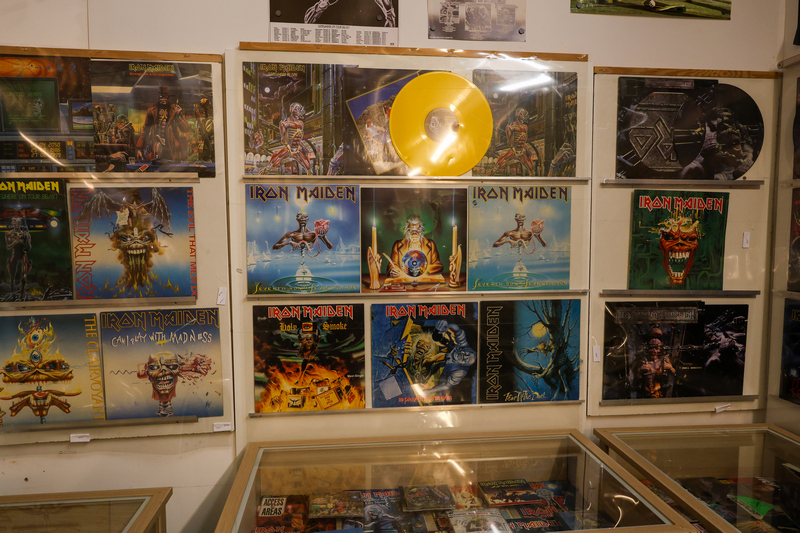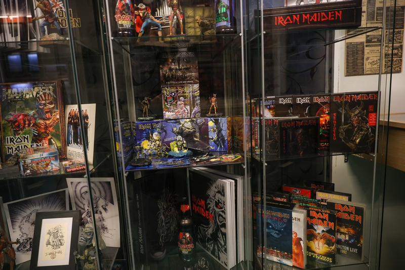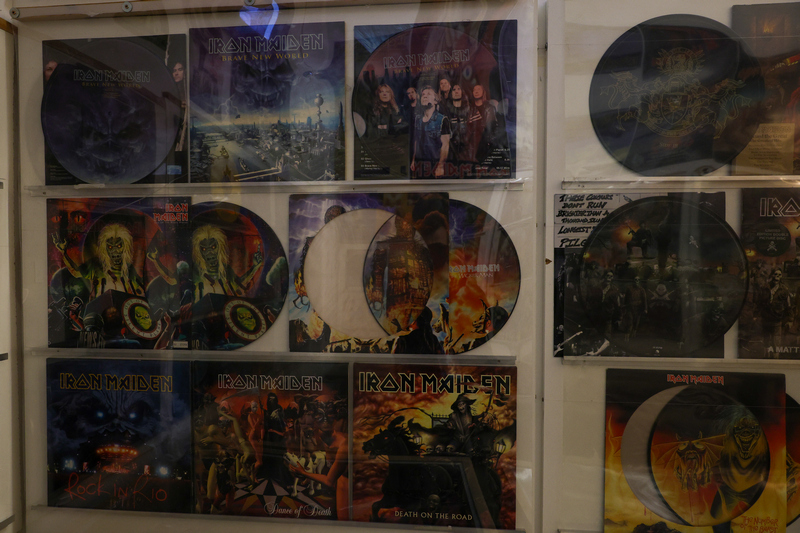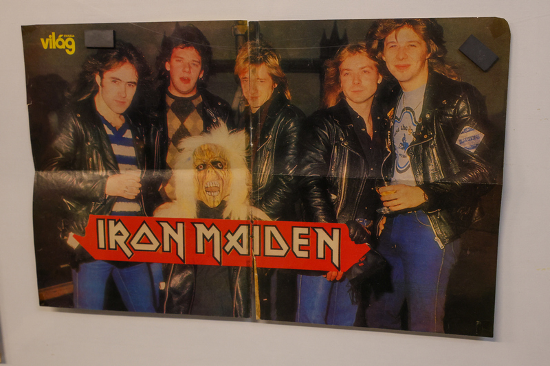 A beszélgetés után a kisterembe mentünk át, ahol Péter gyűjteményének egy része került fel a falakra és az üvegvitrinek polcaira. Miután megnéztem az állandó rocktörténeti kiállítást – amit egyébként minden zene- és hangszerkedvelő figyelmébe ajánlok –, én is végigböngésztem ezeket az Iron Maiden-kincseket. Biztos voltam benne, hogy olyan lemezekkel, CD-kkel fogok találkozni, amiket én is örömmel látnék a polcomon. Természetesen ennél továbbment a kiállítás, hiszen nem csak a picture disc kiadások nyűgöztek le, de a Magyarországon először, a Világ Ifjúságában megjelent kétoldalas poszter is mosolyra fakasztott.