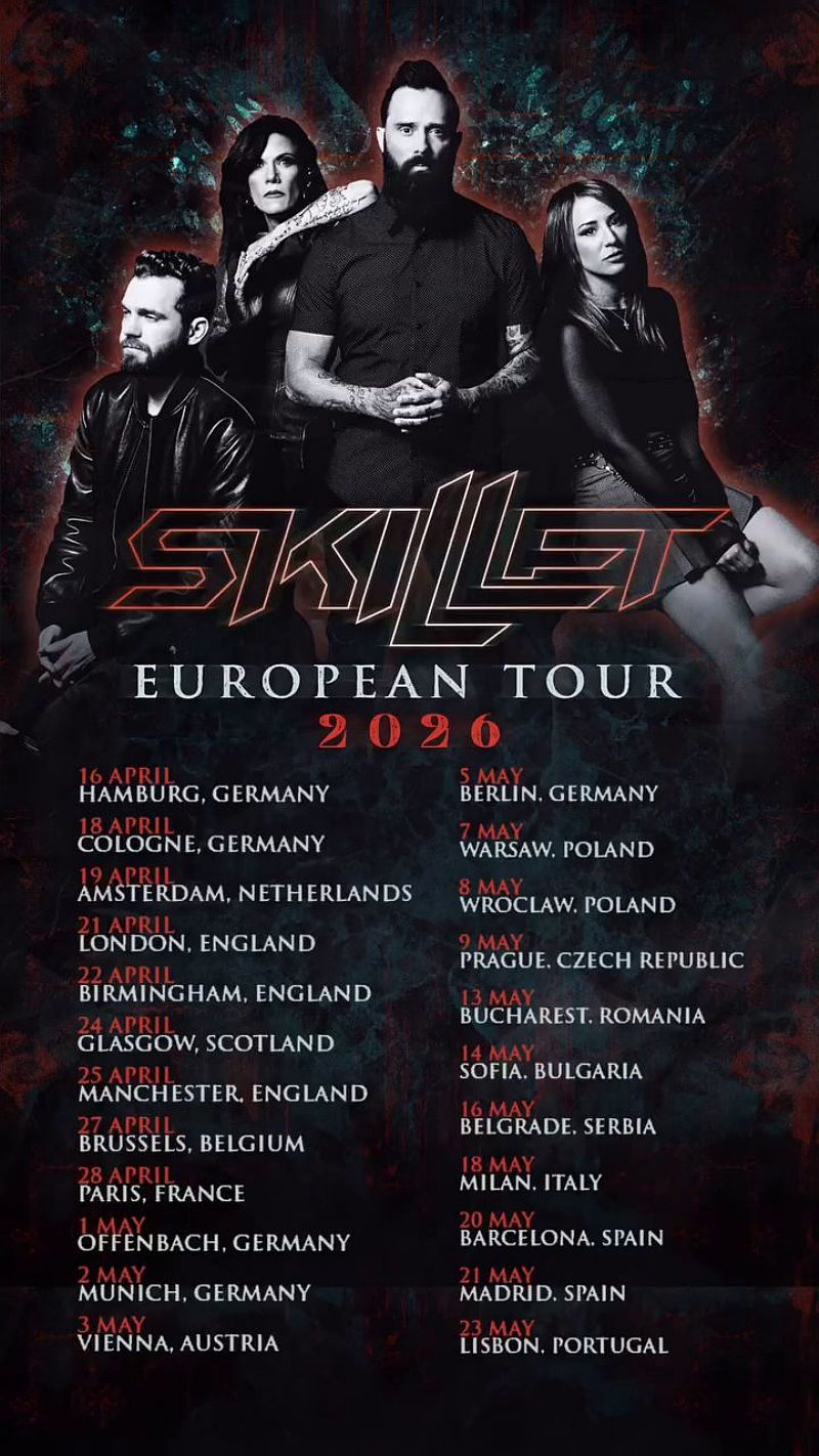 Alig pár napja ért véget a Skillet 101 (!) koncertből álló világ körüli turnéja, de már 2026-ra készülnek. Bejelentették a jövő évi európai körútjuk állomásait, a 23 helyszín között magyarországi sajnos nincs.